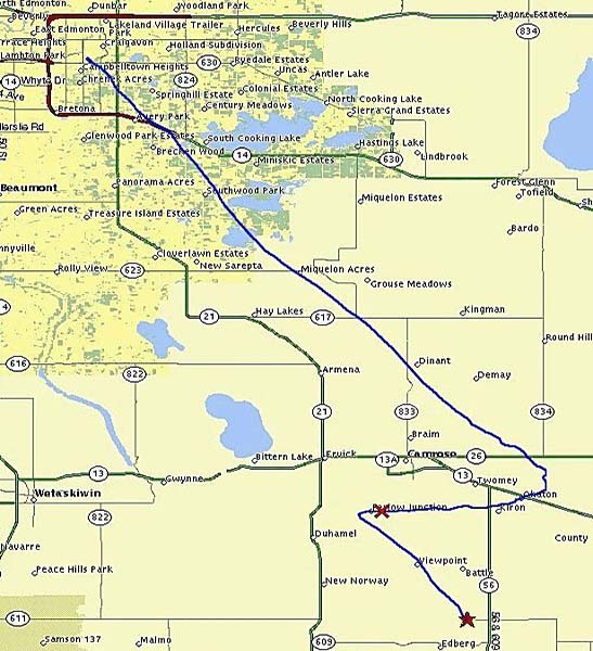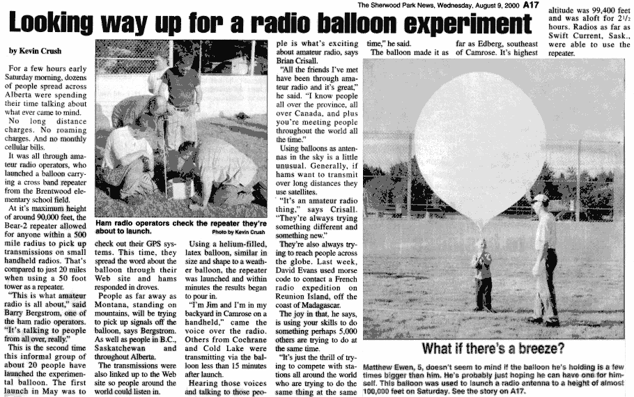 BEAR-2 - August 5th, 2000BEAR-2 was launched at 8:48 AM MDT (14:48 UTC) from Sherwood Park, Alberta, BEAR-2 landed at 11:34 AM and was located in the middle of the Battle River at 11:45 AM, |