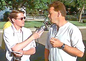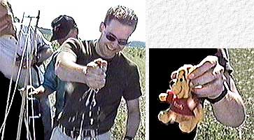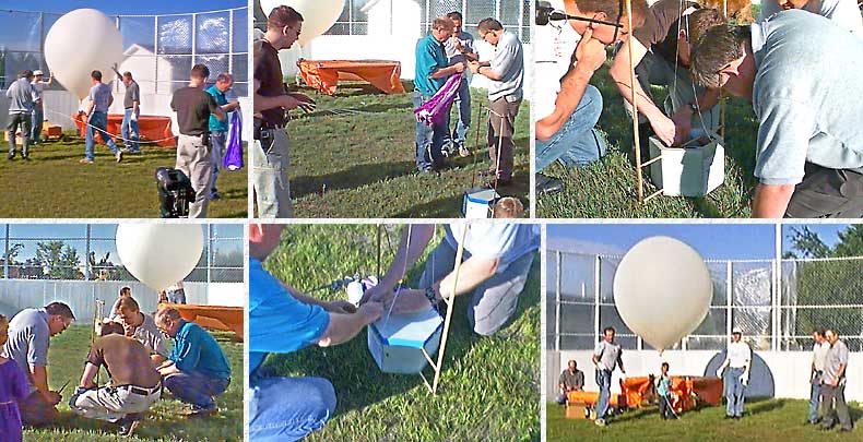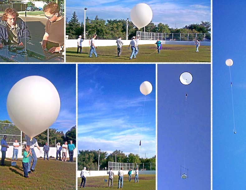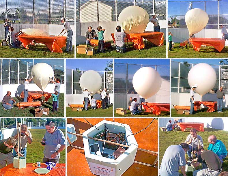 ![]() The launch site was an outdoor skating rink that allowed a wind break to be easily built by placing 3 mil polyethylene on the screening at the upwind end of the rink. The plastic didn't even need to be attached as the breeze kept the plastic firmly held in place against the screening. While the balloon was filled, others were busy getting the payload ready and attaching the parachute. Everything appeared fine on the workbench, but a problem with interference to the cross-band repeater was discovered at the last minute that we frantically tried to resolve. The interference turned out to be from the camera's micro-processor and the problem was just now discovered as the digital camera and repeater had never been operated together at the same time before. There was only one solution which was to unplug the digital camera! The camera was a last minute addition and it's picture quality was not that great anyway. The payload was then quickly taped closed as Matthew (son of James, VE6SRV) had the honour of holding down the filled balloon. Brian, VE6BCA, and Garrett, VE6RKY, check that telemetry and all systems are operational before giving the final go ahead for launch. Matthew passed the largest helium balloon that he will likely see for a while on to the launch crew that gently released BEAR 2 on it's way to near space. |