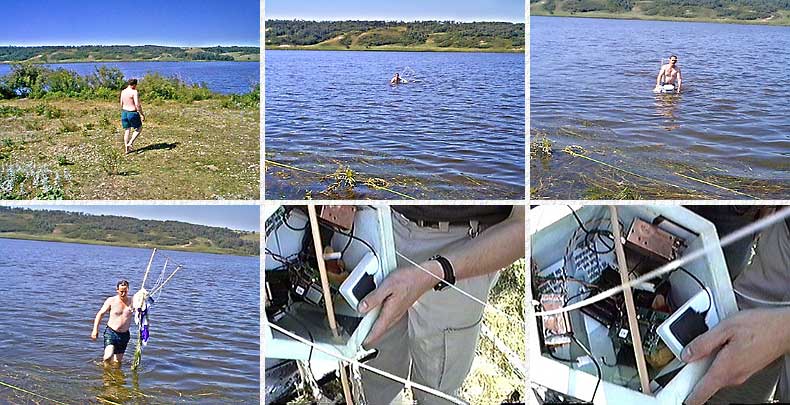 ![]() An amateur in the area was contacted on 2 meters and was on his way with a boat. But an hour after 'splash down', when the telemetry radio quit transmitting that should have functioned for several days, James figured that the payload may be taking on water and that he had better swim out and rescue the payload before it sank. This was no small task as it was nearly a quarter mile swim to the package. |