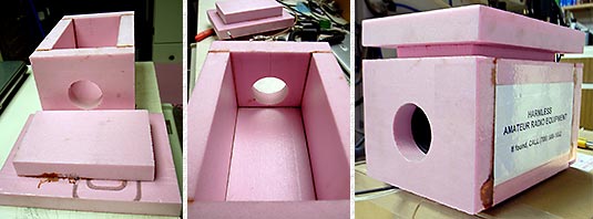 Right - This photo taken after recovery shows how the camera was packaged and kept in place. The two 5 AA cell batteries were placed on each side of the camera, small foam blocks were placed in front and behind it, and the box was sized so the center piece of foam in the lid would keep the camera from moving vertically. A UV filter was used to keep water from entering the camera through its lens opening in the event of a water landing and a rubber sun shade screwed onto the filter and that fit the opening in the box tightly was used to keep water from entering the box through the opening. |