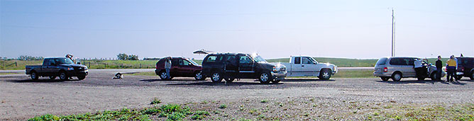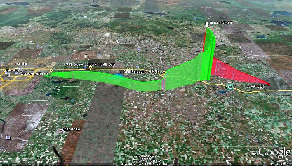camera and could have been much worse, but again we were lucky and we should have taken time to ensure the camera's view wasn't affected by the foam around the hole it had to peer through and affects the corners of the image. Garrett created a perfect spot for his laptop in our vehicle by simply replacing the glove box with a home made wooden shelf. In addition to his laptop, a high-speed wireless modem, Garman Nuvi 350, a second GPS and several amateur radio transceivers were used to receive tracking data, talk with others and do everything else being done. With an internet connection, a laptop and Google Earth is all one needs, and my favorite way, to track a balloon and keep track of where the other vehicles in the group are, but Garrett was also using a Garmin Nuvi 350 and busy running a number of different programs to make landing predictions plus log and I-Gate received data to the internet for others. Feeding data from the tracking vehicles to the web was especially important as we would soon be out of range of any digipeaters and I-Gates where we would be going. And for those that keep asking how we track and make landing predictions, Garrett does a much better job of explaining what all he does then I can and his reply to one of those requests is HERE.