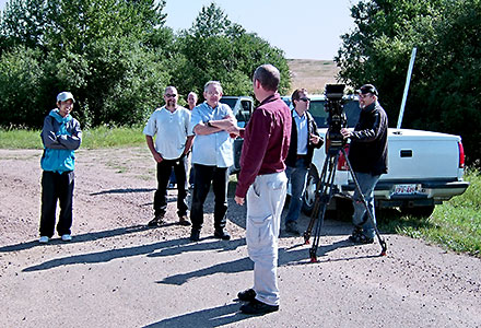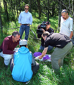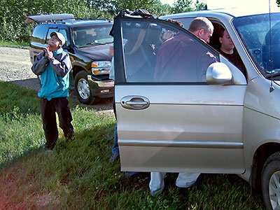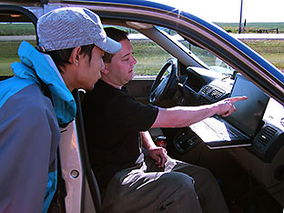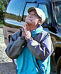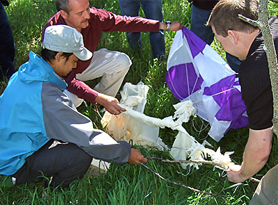 Above - The two with the large camera covered this and our BEAR-3 flight for the Daily Planet TV show on the Discovery Channel and (right) Tomoya prays for the safe return of his camera as James & Garrett are being taped while they track the balloon and it bursts. We stayed at this location