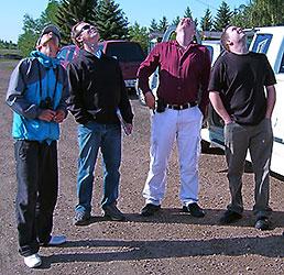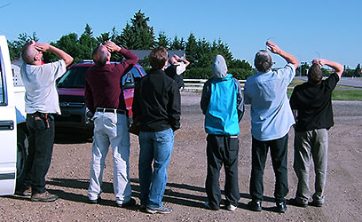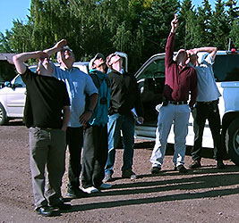 Right - Tomoya gets an update from Garrett, VE6RKY, as to the location of his camera. Below - Watching the balloon pass overhead as it nears 100,000 ft. |
