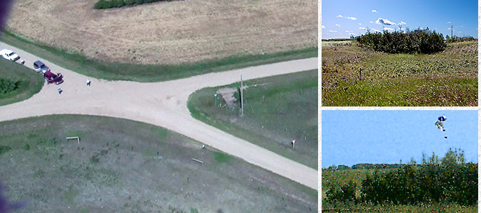 been waiting when the balloon burst. Left - An image from the payload camera video as we stood on the road watching it pass by. Upper & Lower Right - The wooded area next to the road where the camera landed under a fully deployed parachute even though, as usual, the remains of the burst balloon had become all tangled up in the parachute lines (as seen below). |