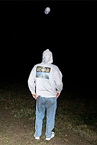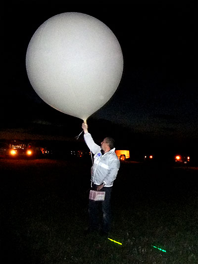 Launching a balloon at night with lights attached is fun and it was interesting to find just how far one can see different light sources. Right - Besides chemical lights, LEDs of various colors tied to ordinary party balloons were also launched during the night to monitor wind conditions. The LED's, each with a tiny battery, were purchased as finger lights in packages of 4 for $1 and were easily visible for several miles. An inexpensive way to monitor the wind at night, but many were also launched just for the fun of it. We normally follow our payloads on the ground and recover them shortly after they land, but this would have to wait this time until after the launch and recovery of Michel Fournier, his capsule and the Le Grand Saut balloon. As we waited to do this, our balloon's altitude approached 100,000 ft. and as dawn approached, we anticipated seeing our balloon suddenly become visible against the semi-dark pre-dawn sky as it entered the sun light high above us. Then shortly before the balloon burst at 114,635 ft. it suddenly appeared like a very bright star although over 30 miles away. |