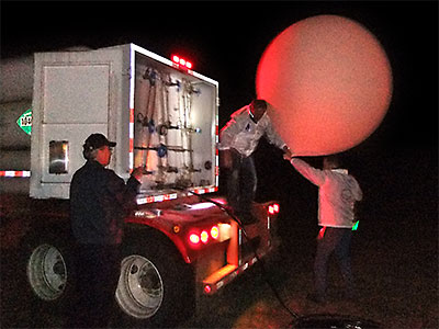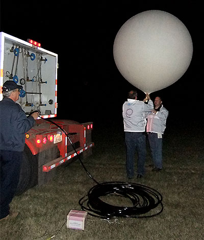 This launch was while we were at The Big Jump and the North Battleford, Saskatchewan, airport to obtain upper wind data in preparation for the launch of the 8 million cu. ft. Le Grand Saut balloon. We weren't sure how large the neck of a 1000g balloon would stretch, but James had little trouble stretching one over the 3" hose fitting on the helium truck and carefully cracked the outlet valve. Needless to say, with 1800 psi pressure present, the balloon quickly inflated with what one could easily tell was more then enough helium to lift our payload at a decent assent rate. |