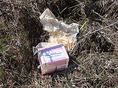 The tracker was found in some brush not far from the road and only about 1000ft. from where its signal was strong enough to be decoded. |