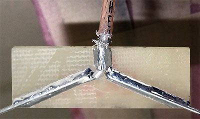 Examination of the antenna answered why tracker data suddenly stopped being received during it's decent and its transmissions could only be detected ≈ a mile on the ground and decoded for such a short distance. The antenna was simply hung a few inch's below the payload box by its coax feed line and survived the BEAR-5 flight OK, but there must have been much more turbulence this time which caused excessive flexing and the feed line shield to become broken where soldered to the antenna. The solution used to prevent this on SABLE-4 was to press the antenna PCB material into a slot cut in the foam box to prevent flexing at the joint (but, as we later discovered, Murphy had another equally good way to screw up this antenna design on that flight). Click here for a BEAR-6.kml file. |