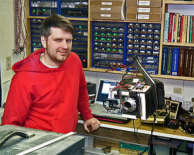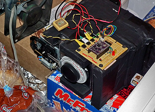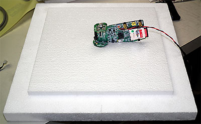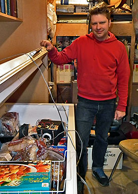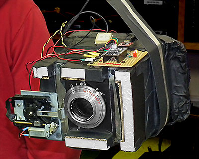 Above - Kevin with the 4x5 camera he made from styrofoam to save weight while it hung from my workshop ceiling during tests of it's shutter control software. Below - The camera while in a freezer to see if the disk eject mechanism from a CD player (lower left in upper right image) used to operate the shutter would work down to at least -18° C. | |||