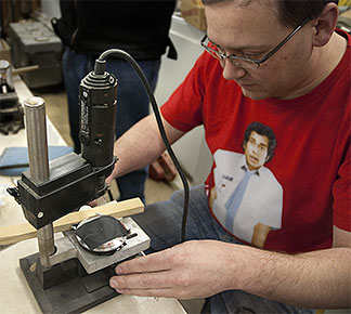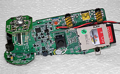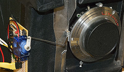 Above - Garrett drills a tiny hole in the lens shutter release lever for a wire rod from the replacement shutter release mechanism (left), a small modified R/C servo. The control electronics were removed from the servo as we simply needed a small motor controlled arm. All traces of grease in the gear train was also removed to ensure cold temperatures wouldn't affect the motors operation. Below - An identical modified R/C servo was used for the balloon release mechanism Garrett came up with. |