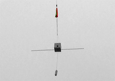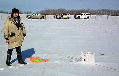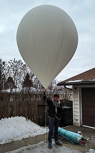 Kevin holds onto the balloon as the rest of us ensure the trackers are both working ok before launching his camera. The primary tracker is in the payload box with the camera, the secondary back-up tracker is in the smaller box hung below and the balloon release mechanism Garrett built can be seen just above the parachute. The two horizontal arms are 4 ft. long 3/8" sq. pieces of hard wood added to reduce the payload package rate of spin. |