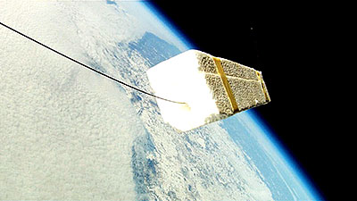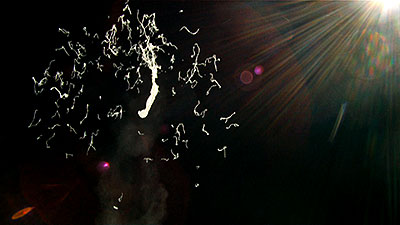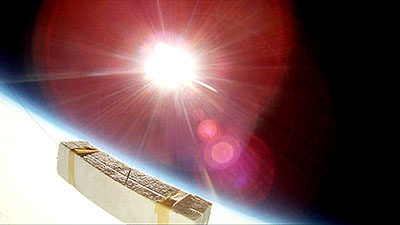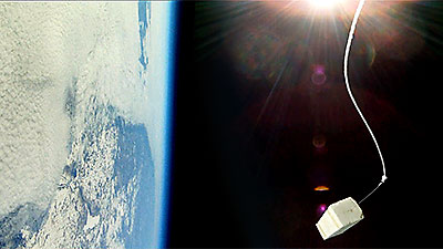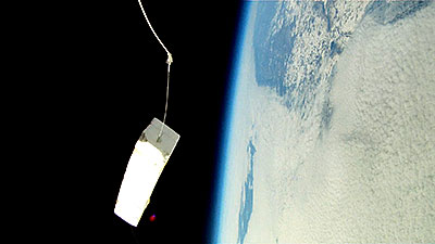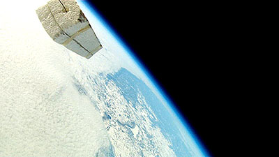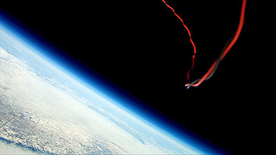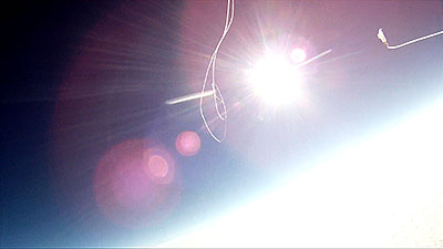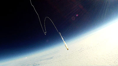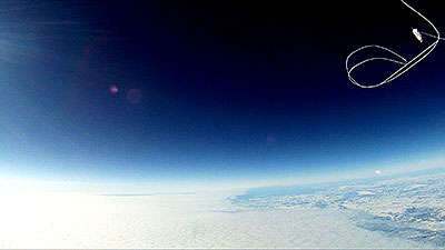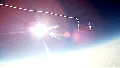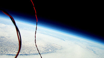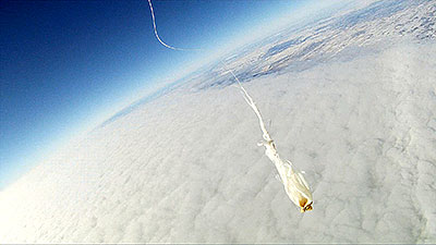 The balloon bursts at 118,146 ft. and a sec. later the video captures what remains of the balloon. Another sec. and everything is inverted as it begins to tumble back to earth and capture a number of images of the tracker that was hanging below until it reaches enough atmosphere for the parachute to begin functioning. | |||