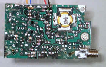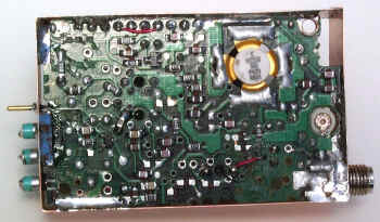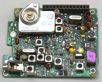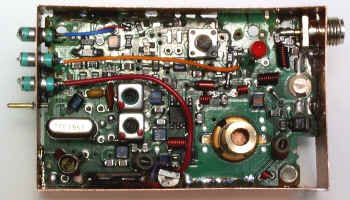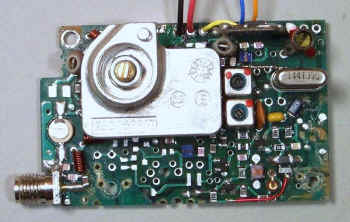 The receiver and unnecessary components were removed to reduce the size, weight and turn the transceiver into a single channel transmitter. Extensive circuit modifications were also made to improve the transmitter efficiency. The heat sink is present in this photo, but the transmitter will be used without it to reduce weight. Transmitter duty cycle is very low with APRS and the output transistor temperature did not increase without a heat sink, at least not enough to be easily detected. |