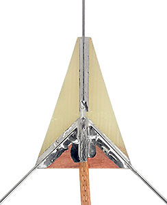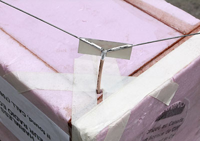 path of the grounded element along the top inside corner of a side wall and then, after a 90° bend, pressed into a slot cut down the center of the front wall top edge. And the red line shows the path of the active element down the back inside corner, through the
