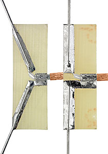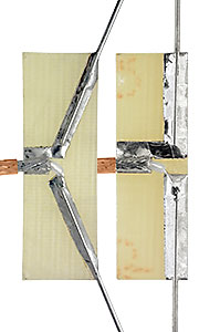 Right - The elements are soldered in place, the coax is fed through the toroid and then the core is glued in place with epoxy. It's important to have the feed line, or other small length of coax, fed through the toroid while it's glued