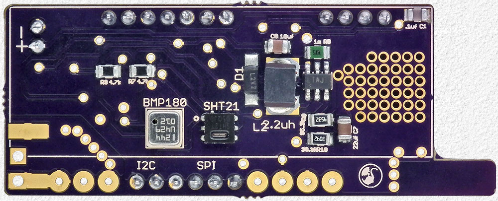 ![]() Above - Bottom Side of the board with the BMP180 & SHT21 sensors. The Tracksoar requires a supply voltage of between 1.5 to 5.0 volts and is supplied with a very nice battery box for 2 AA cells which has a slid on cover held in place with a small screw to ensure the cells will not pop out upon a hard landing or whatever. The tracker has a Step-Up DC/DC converter that provides regulated 5V for the processor and a linear regulator that provides 3.3V for the GPS and BMP180 & SHT21 sensors. |