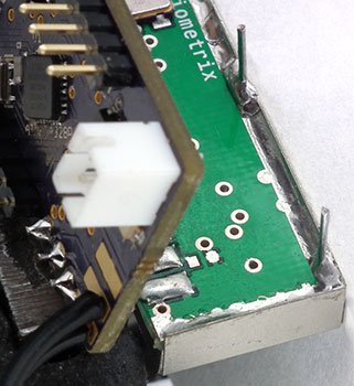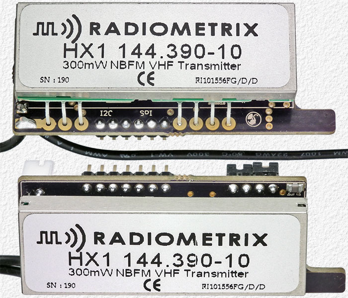 Left - The Tracksoar is designed for use with a Radiometrix transmitter module, but any suitable transmitter can be used. The Micro-Trak 300 tracker I wrote about in 2007 used the same HX1 module and you can read more about the module there and what I had to say about it at that time. I wasn't too impressed with the module as it wasn't very temperature stable, but keep in mind that was a -3 version, 9 years ago, and my Tracksoar has a -10 version which is likely much better and I'll be checking out and reporting on as soon as I have time. Note: With a Radiometrix module one needs to ensure that it remains spaced a short distance off the tracker board to prevent it shorting and having the tracker fail which could easily happen as the top edge of the transmitters metal enclosure lines up almost perfectly with the soldered header pins on the tracker board as seen in the second (lower) image. The trackers come with some pink foam between the two units to keep them separated, but foam can be compressed which could result in a short if the tracker is packed too tightly in a payload or from the force of impact when landing and I believe my method that follows is much better. |