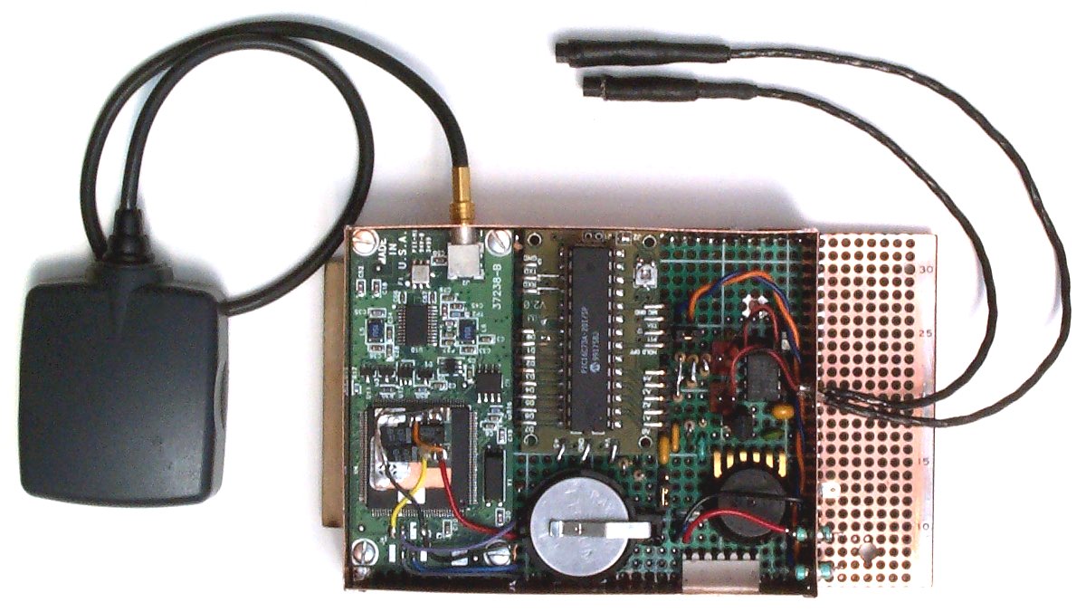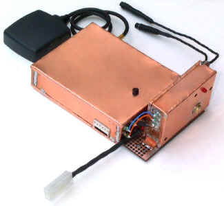 The finished BEAR-2 APRS Tracker The small black component seen poking through the top cover is the payload container inside temperature sensor. 2 more sensors for outside temperature and the cross-band repeater transmitter heat sink temperature are upper-right. Upper-left corner is the GPS antenna. The white connector on the side of the larger enclosure is the Programming Cable connector. The Red Tx LED is on the right side of the transmitter case between 2 holes for tuning adjustments. |