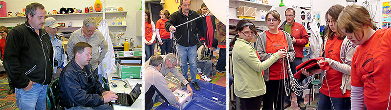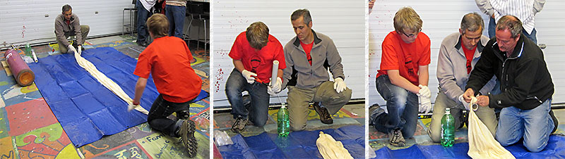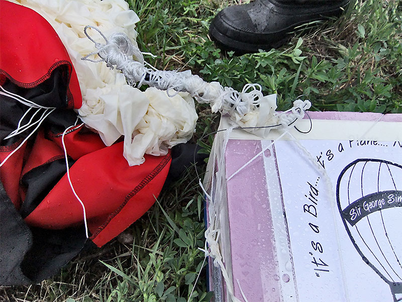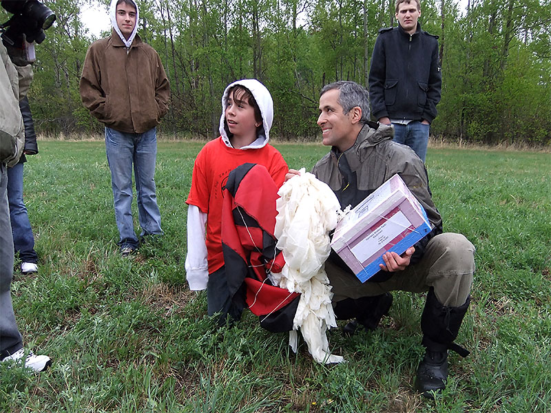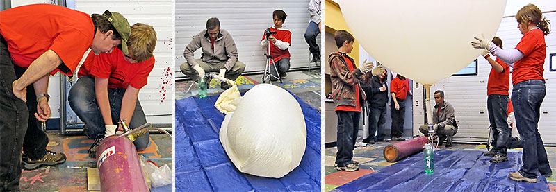 Garrett confirms the APRS tracker is operating 100% before Tony and I seal the payload package. James helps students attach the parachute and the balloon with everything attached and ready to be launched is carefully manoeuvred outside through the close fitting door. | |