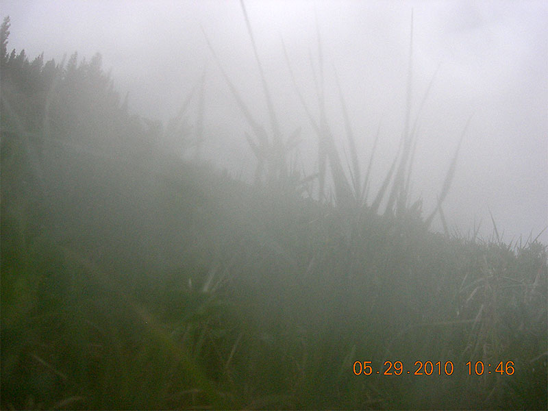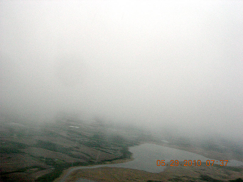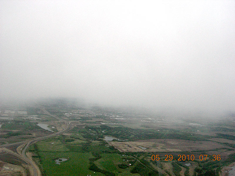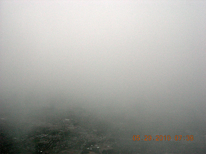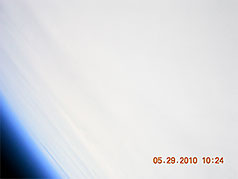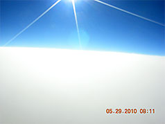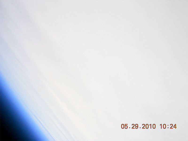 194 images were captured (1/min) during the 3 hr. 14 min. flight, but few showed much detail with it being so overcast. 6 images were captured before the camera entered the clouds and lost sight of the ground at ≈ 3300 ft. It was a beautiful sunny day as usual as the camera emerged above the clouds 33 minutes later at ≈ 31,000 ft., but most of the images were simply a blanket of white for as far as the camera could see with the cloud bank extending hundreds of miles. |
