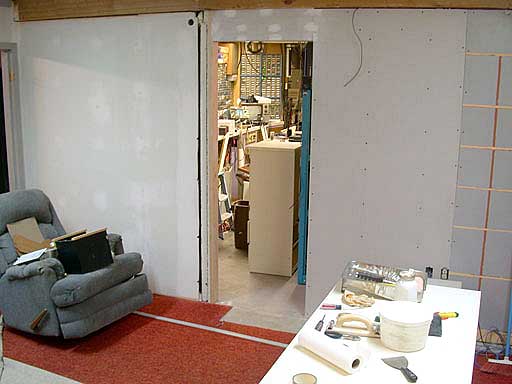 My son, Garrett, has decided it's time to strike out on his own, purchased a house and December 1, 2001, vacated his basement room which shares a wall with my workshop. I, of course, made immediate plans to e–x–p–a–n–d the workshop and renovations began with the installation of a pocket door in the wall between the two rooms that could be closed when we needed to use his old room as a quest room.