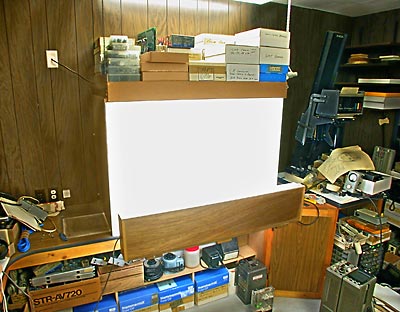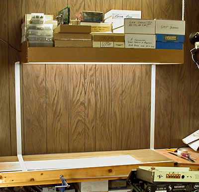 A 4 lamp 2'x4' fluorescent fixture with full spectrum daylight lamps was attached to the wall with the two front corners suspended from the ceiling using 1/4" threaded rod and I immediately realized that the fixture was also an excellent storage shelf. Sides were then added which were simply 1/4" MDF panels attached to the wall and table using tiny "L" brackets and a few screws into the side of the fixture. White arborite was attached to the inside of the side panels and a third piece of arborite was installed down the back of the enclosure with about a 6" radius bend at the bottom onto, and then across to the front of, the table so as to have no back corner visible in photos. A 2 lamp 1'x4' fluorescent fixture with full spectrum daylight lamps is also used in front of the light box to provide front lighting. The box works fairly well, but images sometimes lack contrast with such even lighting and using a couple of reflector type lights may have been a better idea. |