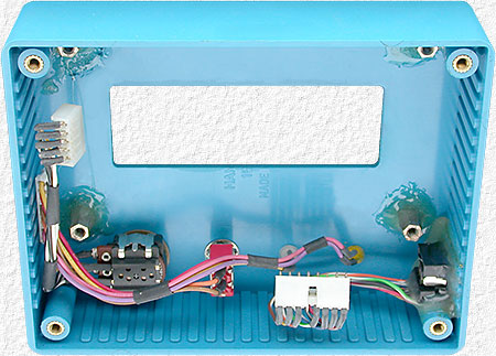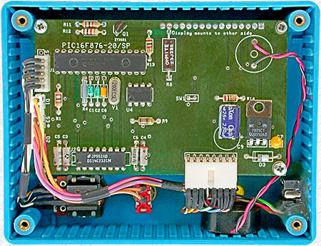 To eliminate any visible screws, the case lid, which is often used for the case front, was used for the enclosure back and standoffs, to fasten the LCD and circuit board to, were hot glued inside the case. If urethane adhesive had been handy, I would have preferred to use that as hot glue may prove to be a problem in a vehicle during hot weather. When using glue to attach items, roughen up the items to give the glue the best chance to hold. For hot glue I also warm the plastic and heat metal items to the melting temperature of the glue. BE VERY CAREFUL when heating plastic items! Three connectors allow for quick and easy removal of the circuit board. |