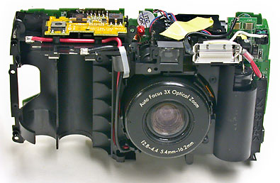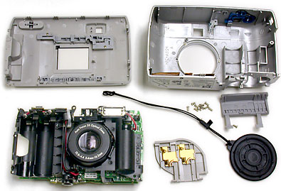 Luckily the smoke was not from the camera, but from one of the batteries that was shorted by a dislodged battery contact. New batteries revealed the camera electronics seamed to be OK, but each time the camera was turned on a loud buzz could be heard from within the lens and the lens did not extend as it should have. The LCD display would then display 'Error Code 106' for a few seconds before the camera turned itself off. It was obvious that something was preventing the lens motor from turning so the next step was obvious - the camera had to be disassembled for further investigation. |