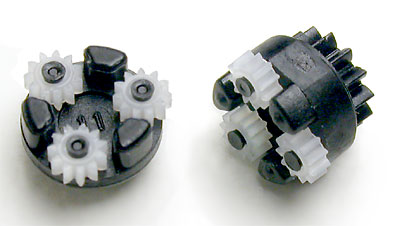Problem found. The tiny motor is held by a single screw through a mounting ear on one side of the motor. Force resulting from the impact had bent the motor's mounting tab which caused the motor's gear to jam up in the mating planetary speed reduction gears. Straightening the motor's mounting tab fixed the problem. Now all that I had to do was put it all back together. (Left) Tiny planetary speed reduction gears. Assembly is only 1/4" in diameter. |