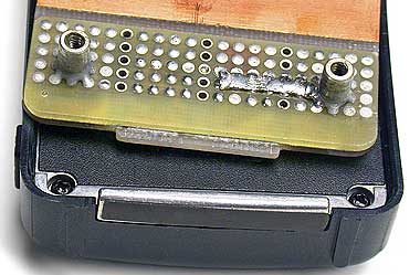 1/4" high threaded standoffs were used on the back side to attach the board to the main enclosure. The battery contacts were fashioned by attaching a piece of prototype board to the backside of the main mounting board. Note how the negative battery contact was tied to one of the standoffs at this point to help improve grounding to the main enclosure. The tab seen along the bottom edge of the mounting board slips under a ledge on the radio and holds the bottom of the radio in place. |