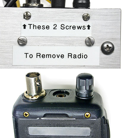 Left image shows the mounting board in place on the back of the radio with it held in place by the tab at the bottom. And the images below show how the radio is held in place at the top using 2 screws through the back of the main enclosure threaded into the 2 threaded brass inserts at the top of the radio back which are intended for a belt clip. It's hard to see, but salvaged 1/4" dia. threaded standoffs of the type found pressed into a panel to keep them in place were used where the 2 screws pass through the main enclosure to keep the screws from pulling the radio too tightly against the mounting board. |