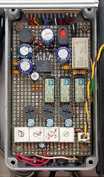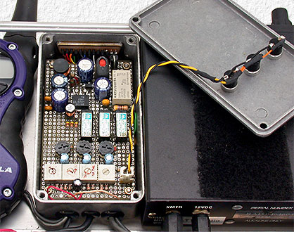 (Above) This is the circuitry required to interface with and control the different units. The three push-buttons on the front of the cast box are programmable TH-7D option buttons as explained in the Kenwood manual. (Right) Upper section is 12V DC power filtering and a switching voltage regulator that supplies 4.5 VDC for the FRS radio and GPS receiver. The remote power switch operates the grey colored relay that controls power to the COM system, the 3 smaller relays are PTT control relays, the 3 round pots are for adjustment of the audio level to each transceiver and the 4 square pots are for adjustment of the received audio level from each transceiver and the alarm tone level from the flight system. |