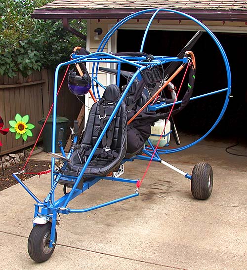 My friend Barry's July 2005 The PPC may appear to be too tall to fit inside my garage, but fits nicely and where it was while I finished a COM system for it and worked on a couple of problems for Barry. To get the PPC into the garage the propeller guard must be lowered a bit in order to clear the door frame, but this is easy to do by simply lifting the front wheel a few feet which has very little weight on it. |