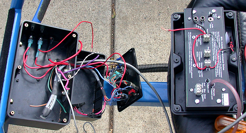Other then two antenna connectors, a single 25 pin connector was used to connect the radio-intercom assembly to other wiring on the PPC to make removal, when the PPC is transported, and re-installation quick & easy. Wiring on the PPC includes connection to the PPC 12 volt battery, the common PTT switch on the throttle control handle, the COM system on/off power switch, LED power indicator and the radio selector switch on the instrument panel, the Stratomaster flight system alarm audio output and from a GPS receiver for use by the Kenwood radio for APRS. |
